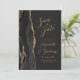 The left-hand edge of this elegant modern wedding save the date card features a black watercolor agate border trimmed with gold faux glitter. The customizable text combines gold-colored handwriting, copperplate and italic fonts on an off-black background. The reverse side features a matching black and gold agate design.