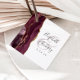 Dieses elegante, moderne Gastgeschenk Hochzeit-Tag zeichnet sich durch ein bordeauxfarbenes Aquarelldesign aus, das mit vergoldetem Imitat-Glitzer besticht. Einfache Anpassung des kohlegrauen Textes auf weißem Hintergrund, mit den Namen der Braut und des Bräutigams in handschriftlicher Kalligrafie über einen großen, blassrosa Bordeaux-Ampersand. Fügen Sie auf der Rückseite eine persönliche Nachricht in der Schriftzeichen hinzu.