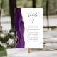 Der links Rand dieser eleganten, modernen Hochzeitskarte mit einer lila Aquarellgrenze, die mit Imitaten vergoldetem Glitzer bestickt ist. Das Wort "Tabelle" erscheint in einem handgeschriebenen Schriftsatz aus Holzkohle auf weißem Hintergrund. Fügen Sie die Namen Ihrer Gäste hinzu, die jeder Tabelle zugeordnet sind.