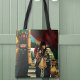 Ägyptische Königin mit rotem Drachen auf der Schulter. Die Königin hält einen Orb eines Universums. Ein schwarzer Löwe mit Flügeln ist auf einem Berg mit einem Sphinx hinter sich.