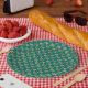 Das goldene Auge des ägyptischen Horus-Symbolmusters auf aquamarinem Hintergrund.