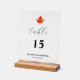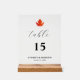 Maple Leaf Moderne elegante Schwarz-Script Hochzeit Tischnummer Akryllische Zeichen. Dieses minimalistisch elegante Design besticht durch ein Ahornblatt mit Tischnummer, Brautnamen und Bräutigam sowie das Hochzeitdatum auf schicken schwarzen Hintergrund. Personalisieren Sie es mit Ihren Informationen. Anzeigen der entsprechenden Auflistung