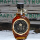 Geben Sie Ihren Firmennamen, Ihre Adresse, das Volumen des Sirup und den Ahornsirup-Grad ein. Elegantes schwarz-goldenes Etikett mit einem goldenen Ahornblatt aus Zucker.