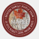 Etikett aus bearbeitbarem Ahornsirup mit Ahornrinde und rotem Blatt.