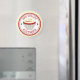 Un aimant avec l'illustration d'un cupcake en velours rouge avec glace blanche à l'intérieur d'un cercle rouge et blanc décoratif avec texte rouge.