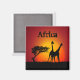 Aimant personnalisable avec illustration vectorielle du coucher de soleil africain, girafes et silhouette d'arbre dans la savane.