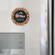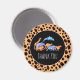 Un aimant de remerciement conçu avec un motif empreinte de léopard orange exotique pour un arrière - plan. Le dessus est recouvert d'un cadre circulaire noir avec une bordure blanche. Illustré avec une aquarelle numérique d'un troupeau d'animaux sauvages qui courent ensemble. Les animaux comprennent un dauphin saut, une girafe, un éléphant, un lion, un kangourou, un rhinocéros et un chat sauvage.