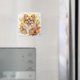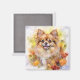 Aquarelle d'un chien Pomchi (Pomeranian/Chihuahua) à la fourrure tan et blanche et oreilles pointues souriant parmi les feuilles d'automne.
