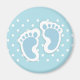 Un aimant avec une charmante image des empreintes de bébé bleu avec un contour blanc épais. Pois blancs sur un arrière - plan bleu bébé derrière l'illustration.