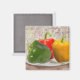 Les poivrons en vert, jaune et rouge s'assoient sur une assiette blanche prête à être cuite. L'original est une peinture miniature à l'huile de Kathie Miller