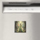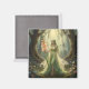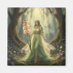 Une belle fée habillée d'une robe verte claire et fluide et de bijoux en péridots avec des pierres de péridot dans ses longs cheveux vert clair et des ailes translucides en forme de libellule tenant un gladiolus se promène dans une forêt magique entourée de fleurs roses et bleues et d'arbres couverts de vignes.