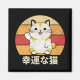 Illustration colorée avec design de texte "Chat chanceux" en japonais et un chat Kawaii soulevant une décoration de main sur arrière - plan rétro rayé