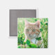 Photo d'un chat gingembre aux yeux vert pâle assis dans une longue herbe verte.