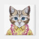 This design objets a portrait of cat in a summer shirt and hawaiian lei.