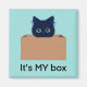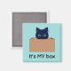 Cute Kawaii chat dans une boîte en carton avec la légende "It’s MY box" sur un arrière - plan bleu vert