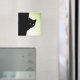 Sly chat noir aux yeux vert émeraude regarde de derrière le mur noir dans une pièce verte.