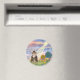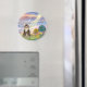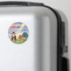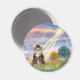 Cette scène paisible dans les tons pastel montre un chat-tabby américain brun à petits haïrs avec un ange dans les nuages qui surplombe un magnifique paysage de montagnes et de feuillage coloré.
