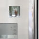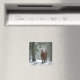 Un aimant avec une photo d'un cheval brun avec une longue crinière blanche et scrupuleuse. Debout dans une forêt avec des flocons de neige qui tombent tout autour.