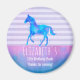 Un aimant d'anniversaire personnalisé avec un joli cheval aquarelle aux couleurs bleu et violet. Courir sauvage et libre. Placez-vous sur un arrière - plan à rayures violettes horizontales avec un flair vintage. Une bordure d'aquarelle bleue et rose est superposée sur le fond.