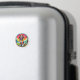 Illustration adorable de dessin animé d'un chien aux yeux brillants, portant un collier et une chaîne, dressé contre un arrière - plan circulaire coloré.