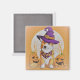 Welsh Corgi à Halloween déguisé assis sur un balai et portant un casquette sorcier avec des citrouilles de son côté