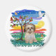 Un chiot de Tzu chih est montré contre un ciel aux couleurs vives et un soleil éclatant. Un cardinal et un oiseau bleu chantent dans un arbre qui coule dans la brise douce.