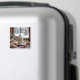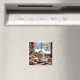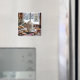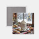 Un bel aimant saisonnier de Noël avec une illustration du chocolat chaud, des biscuits à sucre, des tranches d'orange séchée, des bâtons de cannelle et un sapin de Noël devant une fenêtre d'hiver.