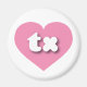 Cet aimant est composé d'un coeur rose cool et calme contenant les lettres coques inférieures, gras, blanches et arrondies, tx, une abréviation ludique pour le Texas, l'état étoilé solitaire.