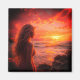 Cet aimant a une dame qui regarde vers le coucher du soleil dessus.