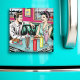 Magnet de style bande dessinée de style pop art rétro. Couple des années 1950 mignon assis dans un diner avec milk-shakes, frites et cheeseburgers à un rendez-vous. Les couleurs utilisées sont turquoises, rose, rouge, noir et jaune. Une nostalgie démodée. Cette photo est dessinée par moi-même.