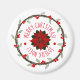 Cet aimant présente un poinsettia rouge profond avec des feuilles vert foncé au centre d'une couronne feuillue twiggy aux baies rouges, et les salutations saisonnières personnalisables bilingues de "Joyeux Noël" et "Joyeux Noel". Dessin numérique original de Dogwood & Thistle.
