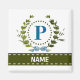 Une couronne de lierre délicate avec un nœud rayé bleu est superposée sur un fond blanc frais. La conception appropriée pour un mariage présente le monogramme "P" en bleu. L'aimant peut être personnalisé avec n'importe quel nom sur la bannière de ruban vert. Astuce de conception : pour la police présentée ici, utilisez des majuscules pour le nom.