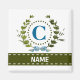 Une couronne de lierre délicate avec un ruban bleu rayé est superposée sur un fond blanc frais. La conception appropriée pour un mariage comporte le monogramme "C" en bleu. L'aimant peut être personnalisé avec n'importe quel nom sur la bannière de ruban vert. Astuce de conception : pour la police présentée ici, utilisez des majuscules pour le nom.