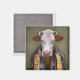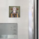 This design objets a portrait of a cow in a leather jacket and scarf.
