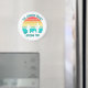 Ce souvenir-aimant cool de cactus couché de soleil est customisé avec votre nom de famille pour un voyage à Phoenix Arizona ou une autre ville d'oasis désertique. Des vacances personnalisées dans des couleurs vives, amusantes, orange et turquoises avec un script personnalisé grunge.