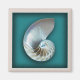 Coquille intérieure d'un nautilus sur un arrière - plan turquoise sertie dans un effet de boîte d'ombre avec un tapis beige.