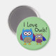 Aimant adorable pour tous ceux qui aiment les chouettes ! Belle illustration d'une mère et d'un petit hibou colorés avec un message "I love owls!" au-dessus d'eux. Arrière - plan vert Springy fait de cet aimant un ajout coloré à une cuisine ou un espace de travail. L'aimant est 2 1/4", rond.