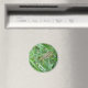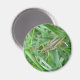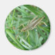 Cet aimant brillant présente une photo macro détaillée d'une petite sauterelle verte avec des marques marron tressées sur l'herbe. Sur la photo vous pouvez voir le détail des jambes articulées, des antennes longues et des yeux noirs et or de la sauterelle.