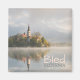 Aimant photo souvenir d'un lever de soleil brumeux au lac Bled avec l'île avec l'église et brouillard avec réflexion dans l'eau à la première lumière du soleil du matin en Slovénie avec le texte : 'Bled, Slovénie'.