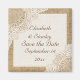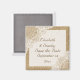Magnifique dentelle blanche sur un aimant "Save the Date" shabby chic en toile de jute, avec dentelle blanche sur lin toile de jute naturelle ou hessian qui recouvre deux coins d'un rectangle blanc avec une bordure en toile de jute beige. Texte en brun. Notez que la dentelle et la toile de jute sont "imprimées" et ne sont pas du véritable tissu. Ce design élégant, shabby chic sophistiqué et romantique avec une essence rustique fait partie d'une collection de mariage et est parfait pour un mariage champêtre chic ou western au printemps, en été ou en automne, avec une palette de couleurs neutres.