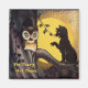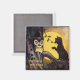 Carte postale vintage d'Halloween montrant un chat un peu tendu criant un avertissement au hibou aux yeux larges dans l'arbre. Réimprimé sur cet aimant.