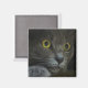 Un gros plan du visage d'un chat gris aux yeux jaunes et des pupilles dilatées, reposant sa tête sur sa patte et regardant attentivement quelque chose derrière la caméra.