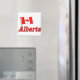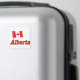 De grandes lettres rouges épellent le nom de la province, l'Alberta, avec un drapeau canadien ondulé derrière. Ce design est disponible sur un large assortiment de t-shirts, cadeaux et autres vêtements.