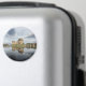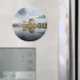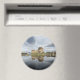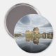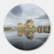 Un aimant photo rond avec le château historique Eilean Donan Castle sur une matinée tranquille avec réflexion dans l'eau calme sur la côte ouest de l'Ecosse, près de l'île de Skye.