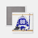 Un maillot de hockey sur glace personnalisé en bleu et blanc suspendu dans un vestiaire sportif avec casque, patins à glace et bâton de hockey sur glace. Le maillot peut être entièrement customisé avec le numéro et le nom de votre choix pour faire un grand cadeau pour le fan de hockey sur glace, joueur de hockey sur glace ou entraîneur de hockey sur glace. D'autres couleurs sont disponibles dans notre magasin et nous accueillons les demandes personnalisées pour différentes combinaisons de couleurs pour vos couleurs d'équipe. Contactez-nous via notre magasin avec votre demande avant l'achat et nous serons heureux de le créer pour vous.