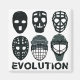 Conception montrant l'évolution des masques de gardien de but de hockey sur glace de la fin des années 50 quand ils ont été portés pour la première fois à l'époque moderne.