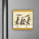 Cet aimant carré a une famille de chats de deux chats adultes bruns et deux chatons qui portent tous des parapluies en marchant dans la neige sur un arrière - plan jaune pâle avec des bordures dorées en haut et en bas.