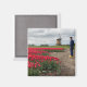 Aimant photo souvenir d'un fermier portant des chaussures en bois jaune inspectant ses tulipes rouges avec en arrière - plan un moulin à vent traditionnel au printemps dans la région fleurie Bulb dans la Pays-Bas.