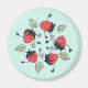 Aimant mignon aux fraises avec une illustration vectorielle représentant 5 joyeuses fraises souriantes dansant dans un cercle entouré de feuilles et de fleurs de leur propre espèce. Design amusant avec un esprit de printemps pour une personne qui aime ces fruits délicieux.