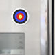 Un simple aimant frigo rond amusant pour archers et entraîneurs de tir à l'arc, chasseurs d'arc et autres tireurs et hobbyistes compétitifs, avec une cible de tir classique avec un oeil-taureaux jaune entouré de anneaux rouges, bleus, noirs et blancs.